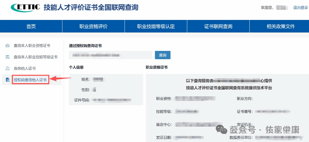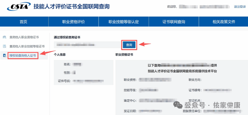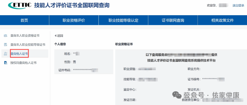 路径:登录后→左侧菜单栏→【查询他人职业资格证书/查询他人职业技能等级证书】步骤: