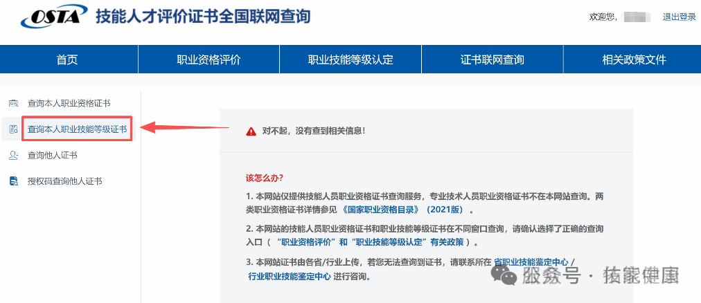 查询本人职业技能等级证书页面图示